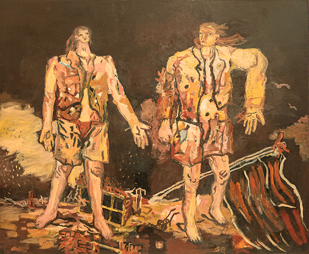 Georg Baselitz is his stage name. Hans-Georg Kern has derived this from his birthplace Großbaselitz in Saxony. His paintings are part of provocative, modern painting. Baselitz became known from 1963 with a picture, a masturbating boy, and by hanging his pictures upside down to direct the viewer's gaze more on the colours and shapes. In the picture "The Great Friends" Baselitz shows two young people in tattered clothes, who seem to have escaped a fire storm barefoot with their lives. Patriotism fell by the wayside. The flag is in the dirt. The friends, the remains of the city and the surrounding rubble are presented in distorted proportions. The colours black, red and golden yellow dominate, there is an exceptional situation.