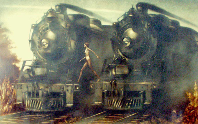 "Parallel Tracks", 1.5 x 2.5 m, 1989, oil on canvas (private collection). The picture conveys the difficult and dangerous relationship between man and machine. Steam locomotives seem to race through fog, every obstacle would be pierced or thrown away, while at the same time a tender young woman playfully jumps from one colossus to the other.