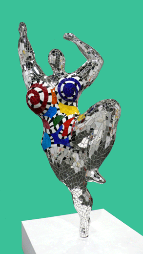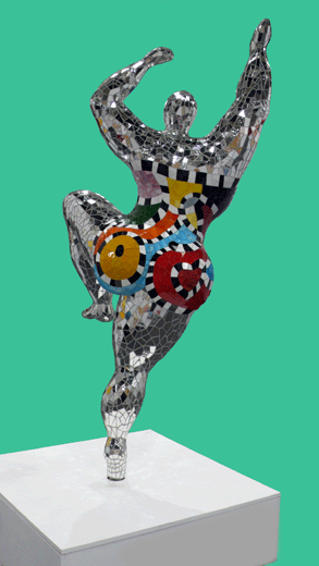 Niki de Saint Phalle created various versions of her lush, colourful Nanas. The surface of the object is provided with mosaic mirrors. The female proportions of the front and back are highlighted in colour. The work was created in 1995 and has the dimensions 260 x 125 x 95 cm. More about the biography of Niki de Saint Phalle can be found here. |