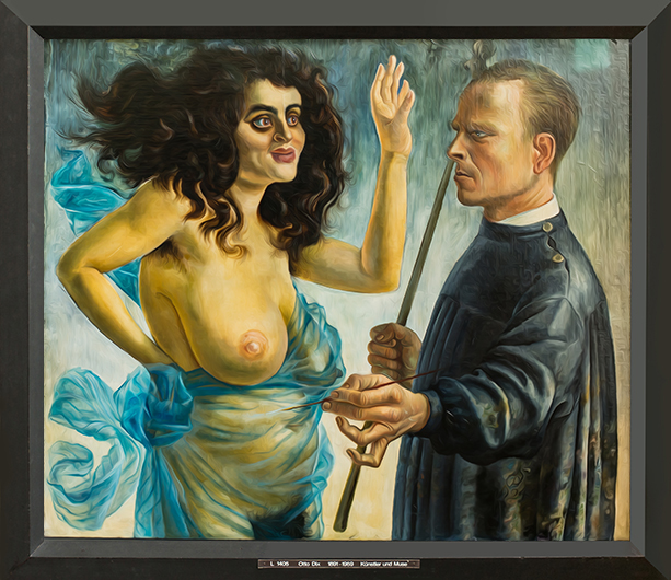 In the self-portrait with Muse by Otto Dix, Greek mythology focuses on a goddess of the arts and sciences. The erotic and voluptuous body clothed in a blue, transparent veil is in a wind stream. The curly, dark brown hair and veil swirl in the wind. Only the second look is directed to the artist himself. What gesture does the raised hand of the goddess of art hold, should the painter be kept at a distance in his clerical, colour-smeared smock? The mutual view creates a field of tension, while the painter leads the fine brush on the transparent veil of the Greek goddess in self-assured calm. It is an artistic scenario, a sensual metamorphosis that gives the appearance of reality. An ingenious and masterly work in perfect three-dimensional perception.