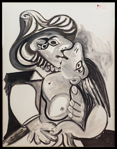 The lifetime achievement of Pablo Picasso is enormous. He was well known for his affection for women. At the age of 88 he created the picture "The Kiss". The emotional devotion of the female figure with open hair is shown surrealistic full-bosomed. Monsieur with hat enjoys his heartfelt kiss. The right, lower-reaching hand seems to indicate the inevitable. She is still resisting.