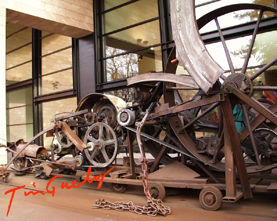 Parts made of scrap are getting loud and lively through a bizarre kinematics. Through the crank mechanism, the object moves back and forth, the sounds of the grinding chain in the foreground associate a chained galley slave. The object is roofed in front of the museum. Each ticket to the Jean Tinguely Museum in Basel has a red signature by Jean Tinguely. (Own digital image supplement, 1999).