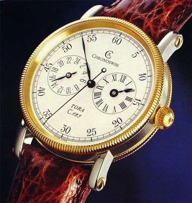 An exclusive classical time zone watch is the represented wristwatch with a mechanical calibre, fine adjustment and the integrated decentralized faces for two time zones. The local time is indicated on the right face and the time of any other time zone on the left hour face. Since minutes and seconds are identically in all time zones, the corresponding hands are