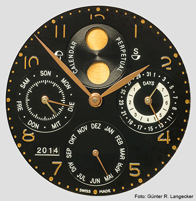 From one full moon to another, 29 days, 12 hours, 44 minutes and 2.8 seconds pass. Most moon-phase clocks or watches have 59 teeth on a gear and two opposite moons on the lunar disc, only one moon is visible whereas the other is concealed behind the mask (59/2 = 29.5 days). The deviation of minus 44 minutes and 2.8 seconds adds up to a day in 32 months..